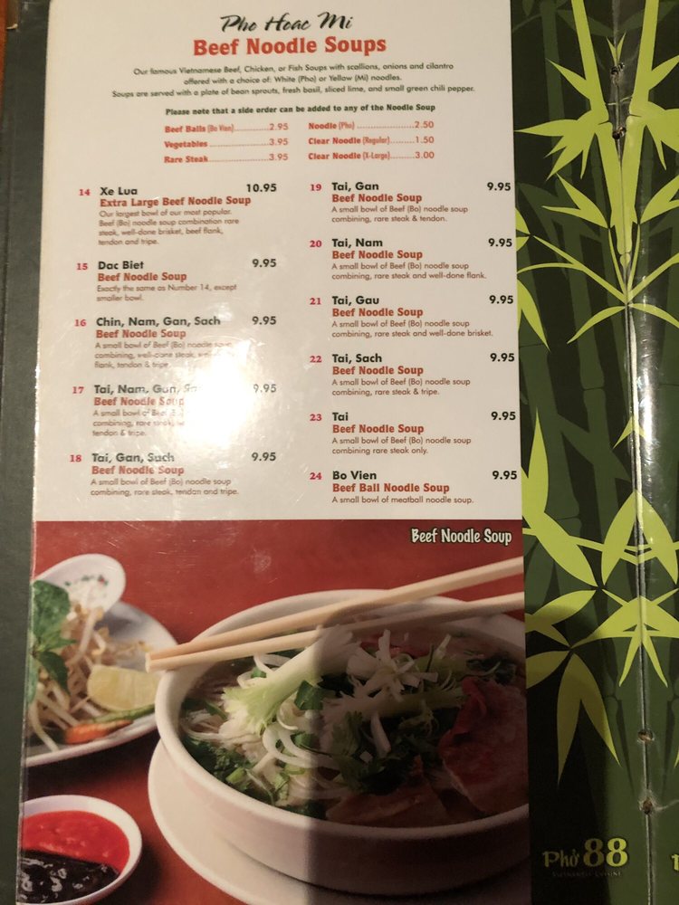Located in Lowell, MA, Pho 88 offers a wide range of Vietnamese dishes with options for vegans and vegetarians. Customers rave about the Bun Bo Hue (Vietnamese Spicy Beef Noodle Soup) and Bun Mang Vit (Duck Bamboo Vermicelli Soup). The ambiance is casual, with a full bar and outdoor seating available. While some reviewers note slower service, others appreciate the quick service and spicy broth options. The menu includes popular dishes like rice noodle soup, fried egg rolls, and vermicelli plates. The restaurant is praised for its generous portions and good prices. Overall, Pho 88 is a solid choice for authentic Vietnamese cuisine in Lowell.